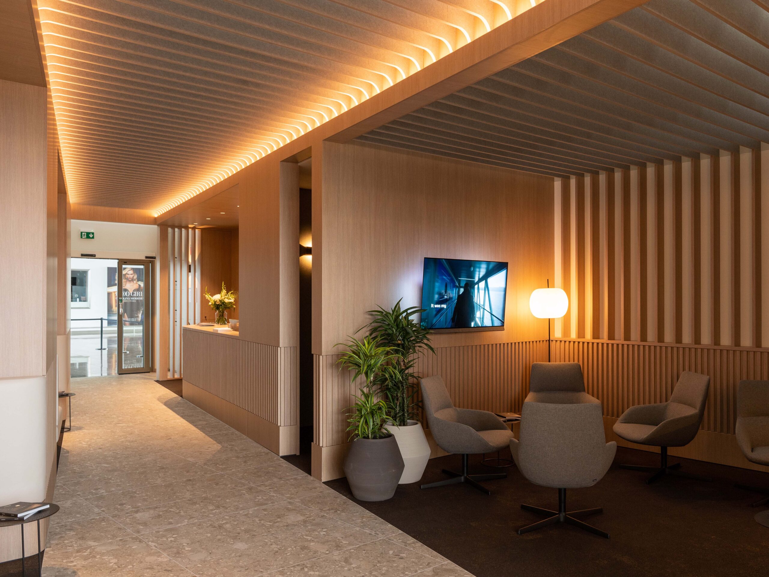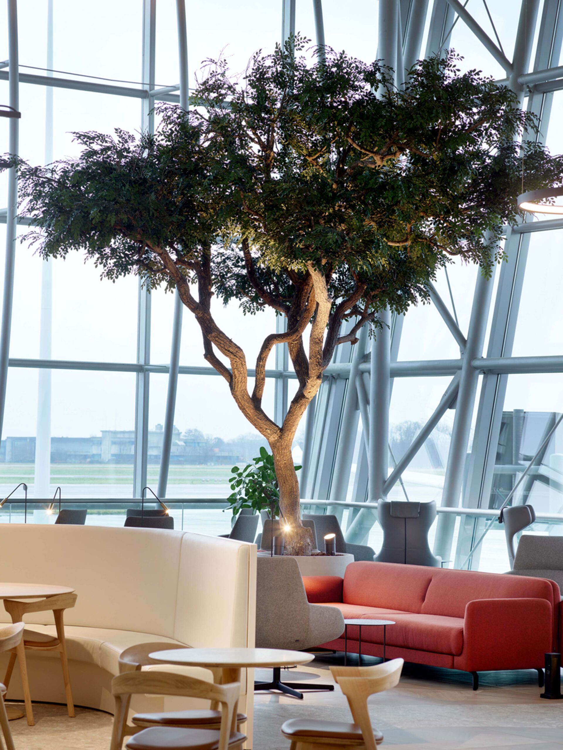 In het hart van de lounge trekt een centraal geplaatste Afrikaanse boom alle aandacht – een sculpturaal symbool van rust, natuur en verbondenheid.