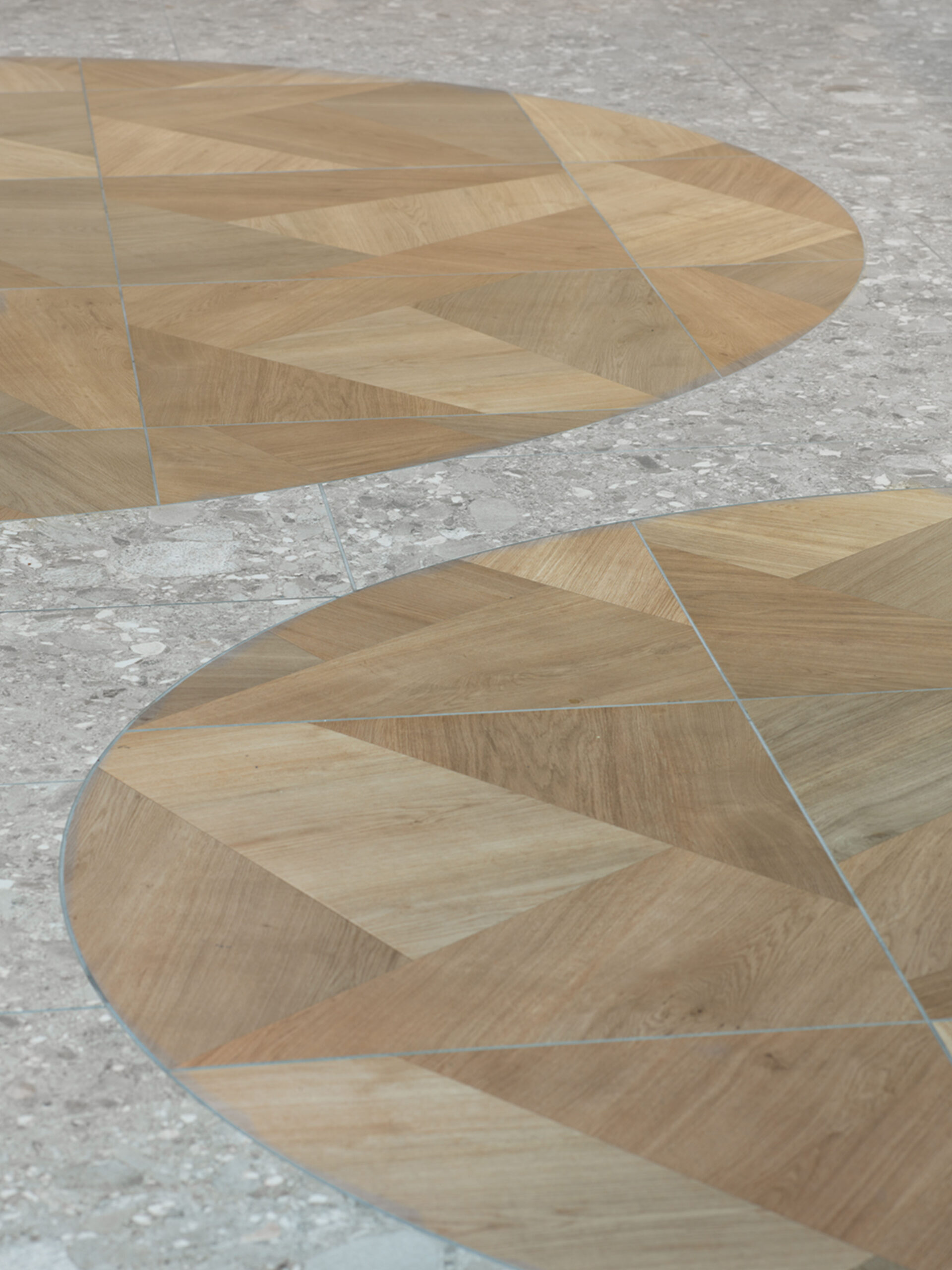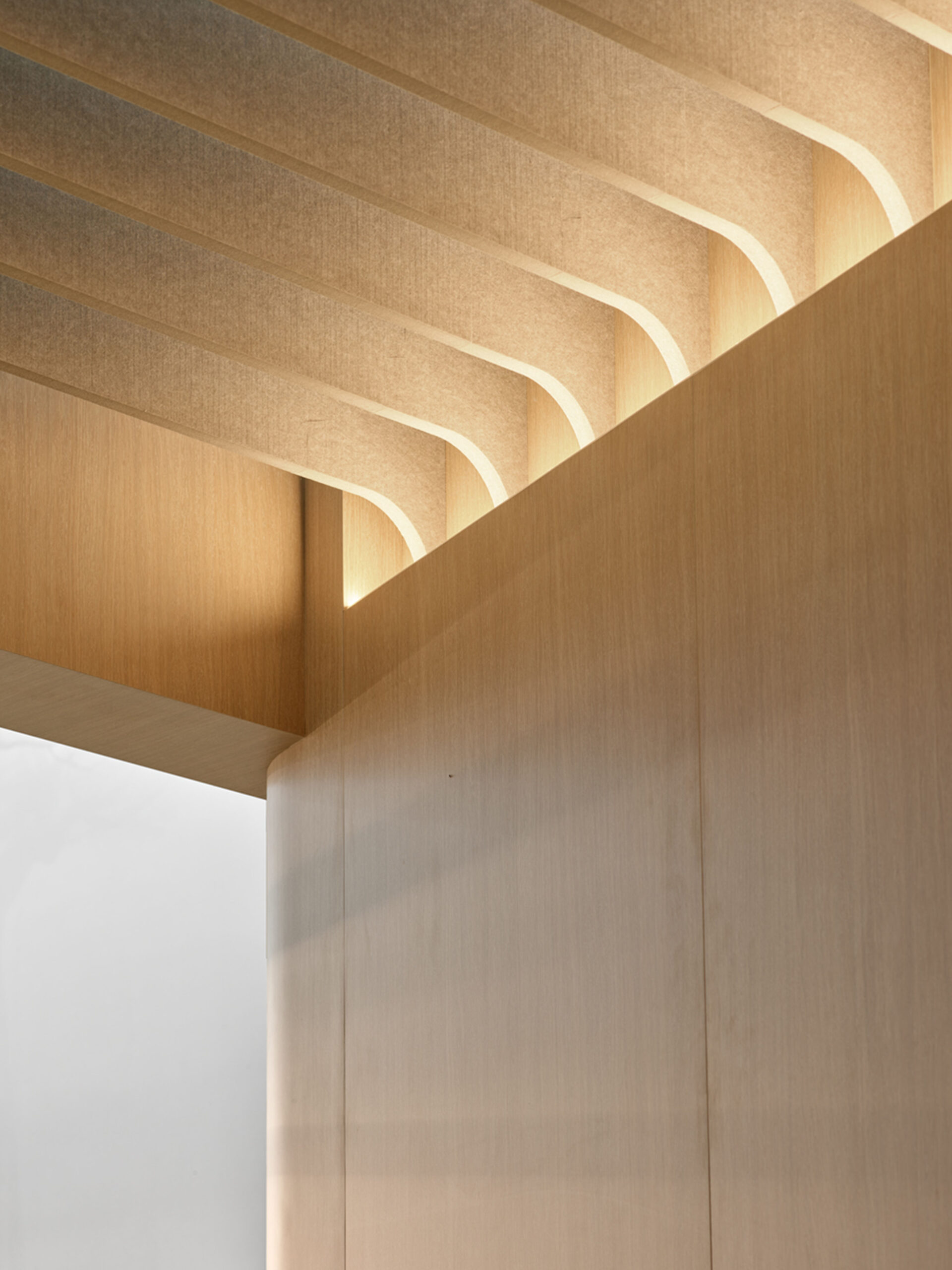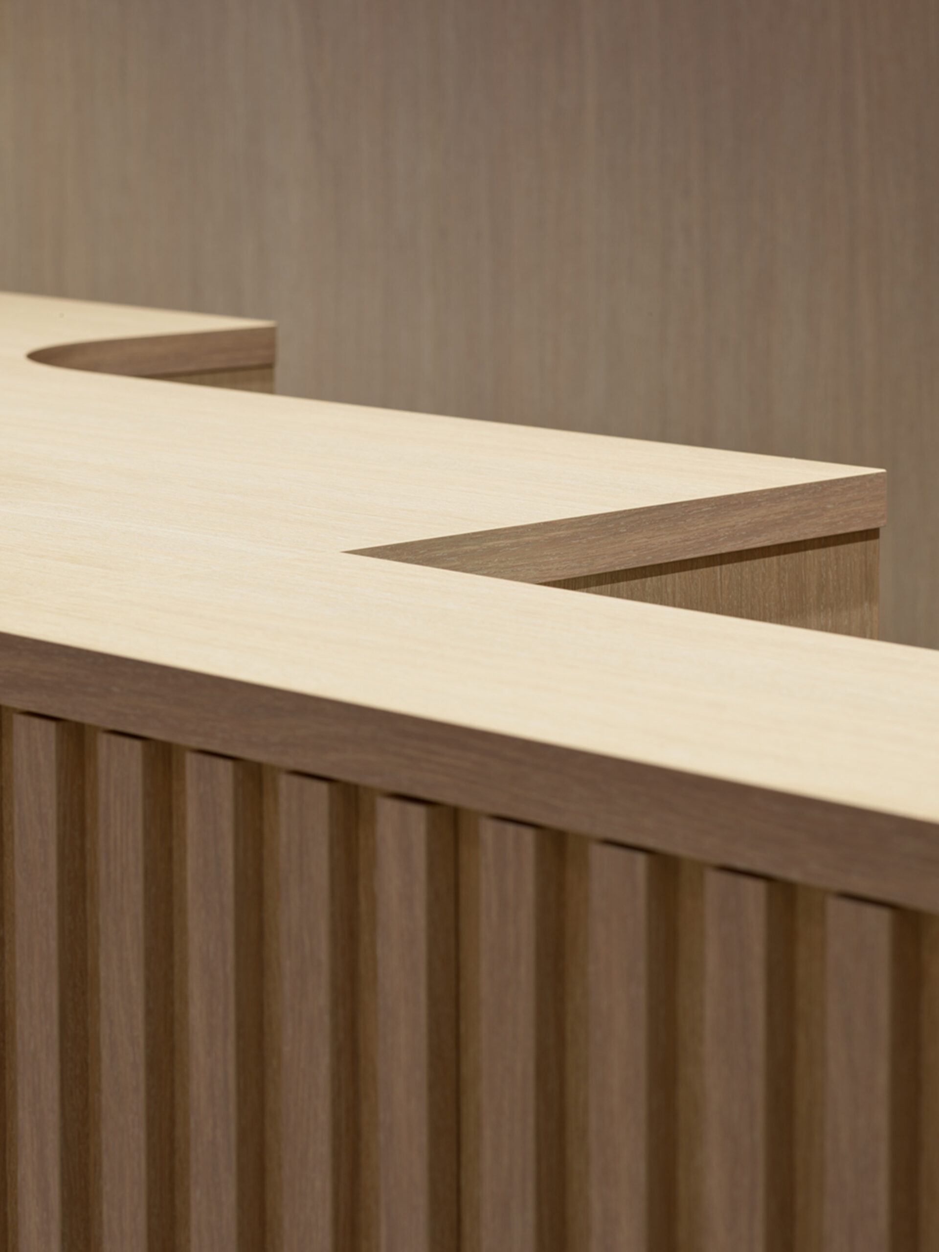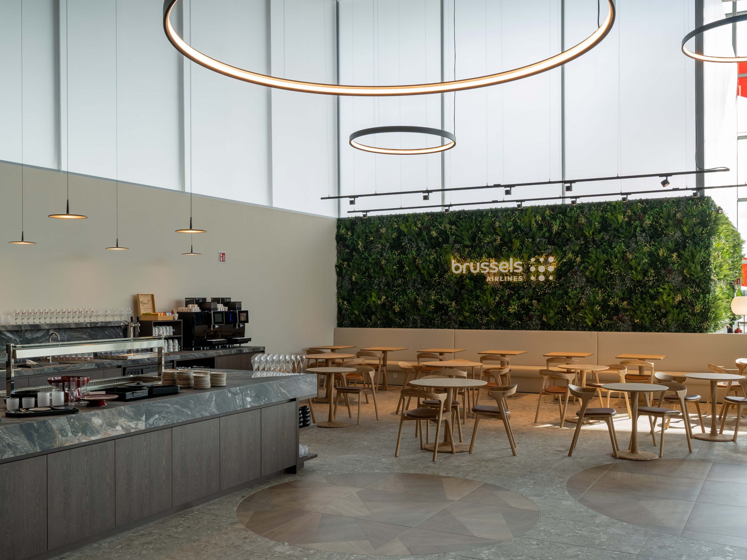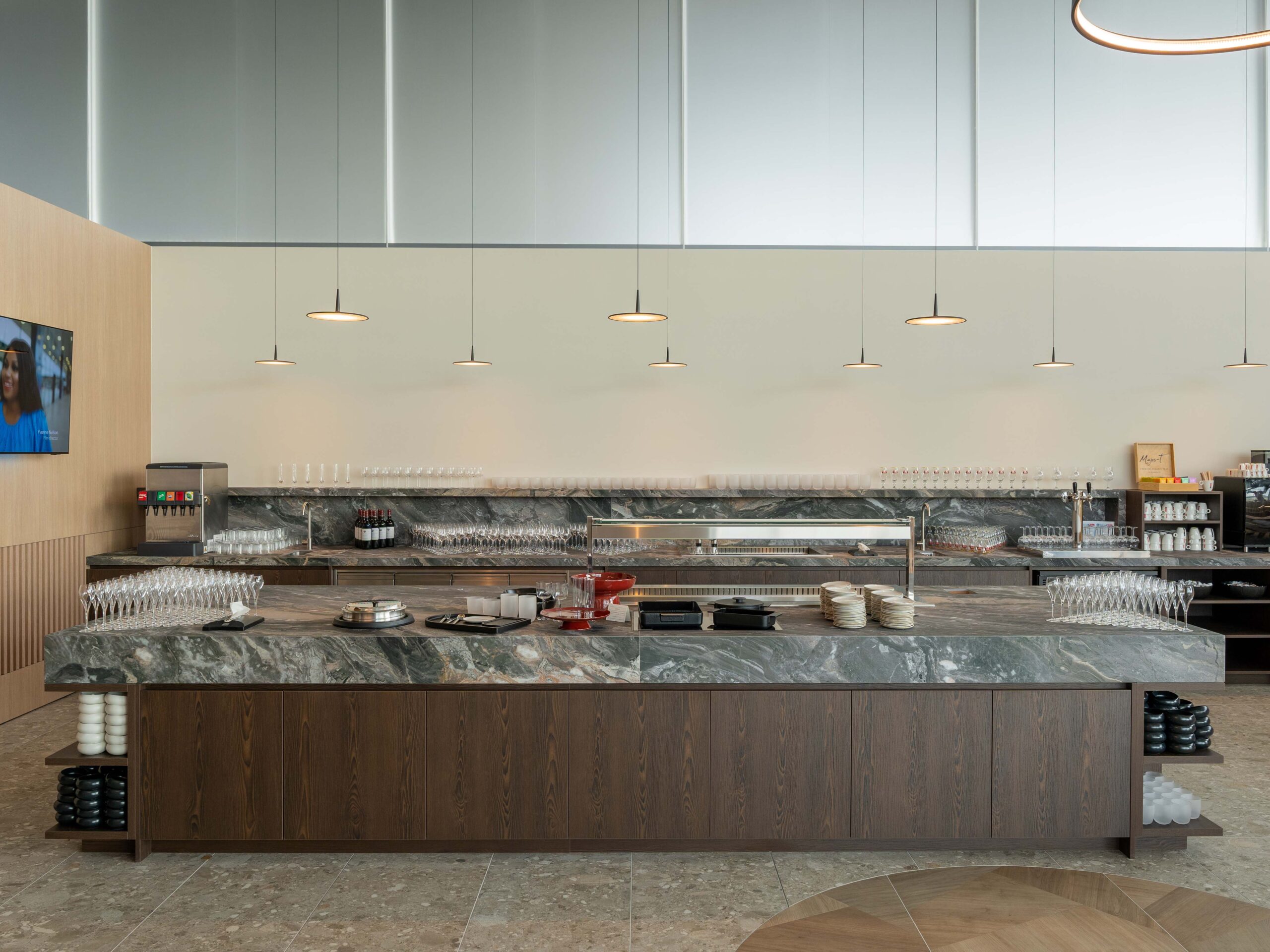 Lichte beige tinten en een akoestisch lamellenplafond zorgen voor een zachte, luchtige sfeer. Het op maat ontworpen buffetmeubel en geïntegreerde zitbank vormen een subtiele afscheiding tussen de verschillende zones.