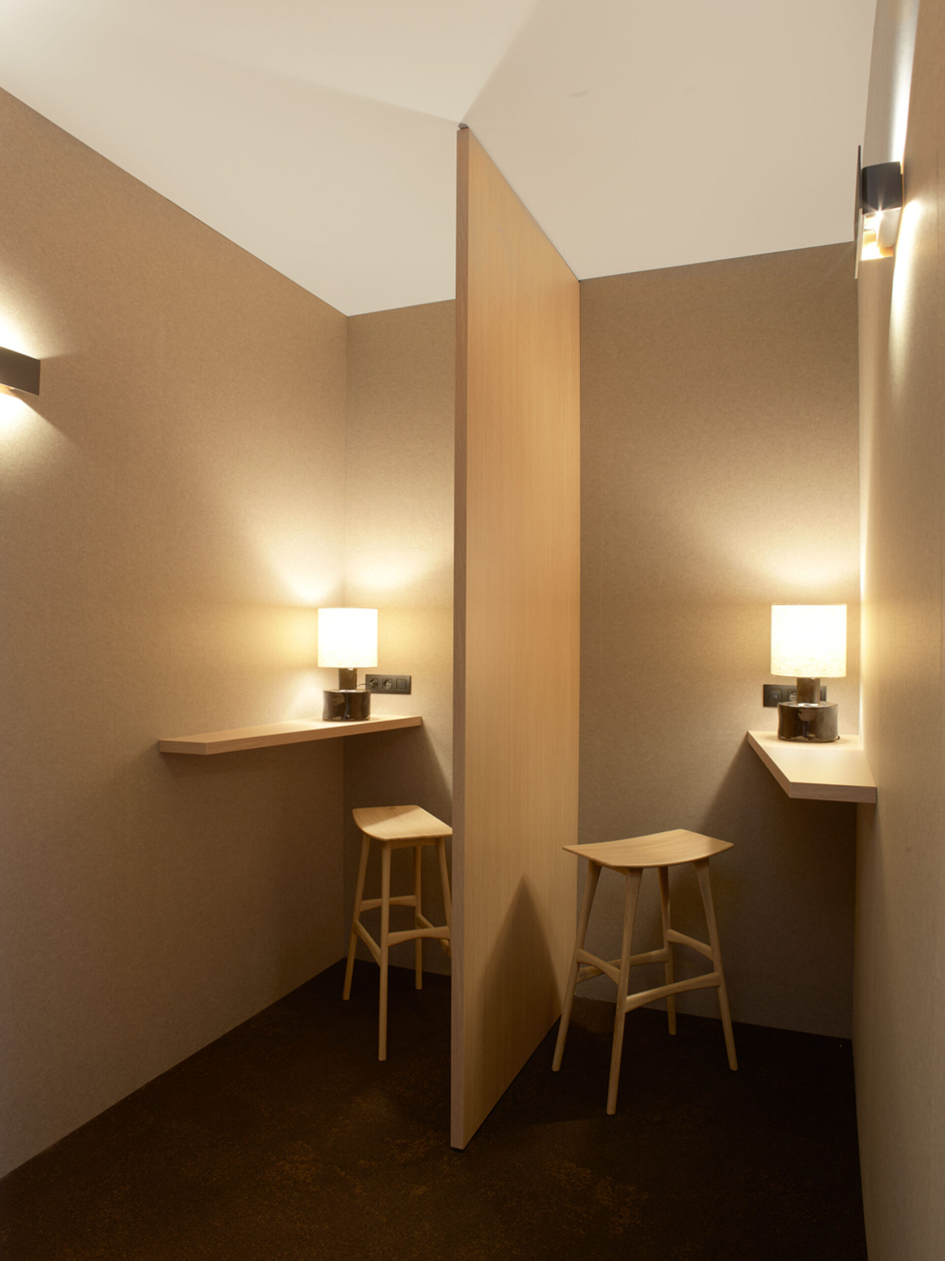 Bij aankomst verwelkomt een trechtervormige balie de bezoekers en leidt hen richting de grote glaspartij waar de open lounge zich bevindt. Het box-in-boxconcept omvat receptie, rustzones, slaapvertrekken, doucheruimtes en sanitair, zorgvuldig georganiseerd voor comfort en discretie.